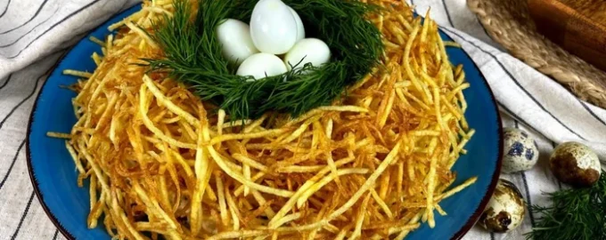- Letakkan salad di atas piring berbentuk bukit dengan cekungan di tengahnya. Tutupi dengan kentang goreng. Taruh tangkai dill di tengah dan di atasnya – telur puyuh rebus dan kupas.