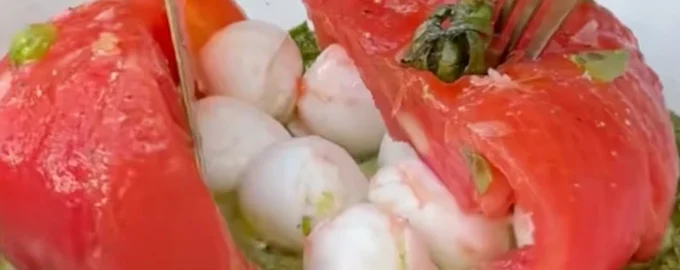 Salad Caprese dengan tomat isi dan pesto adalah camilan ringan, cerah, dan sangat beraroma yang memenangkan hati pada pandangan dan gigitan pertama. Ini adalah hidangan yang ideal untuk makan siang, makan malam atau meja pesta, dan resepnya diceritakan oleh blogger makanan Alexander Ogorodnik.
